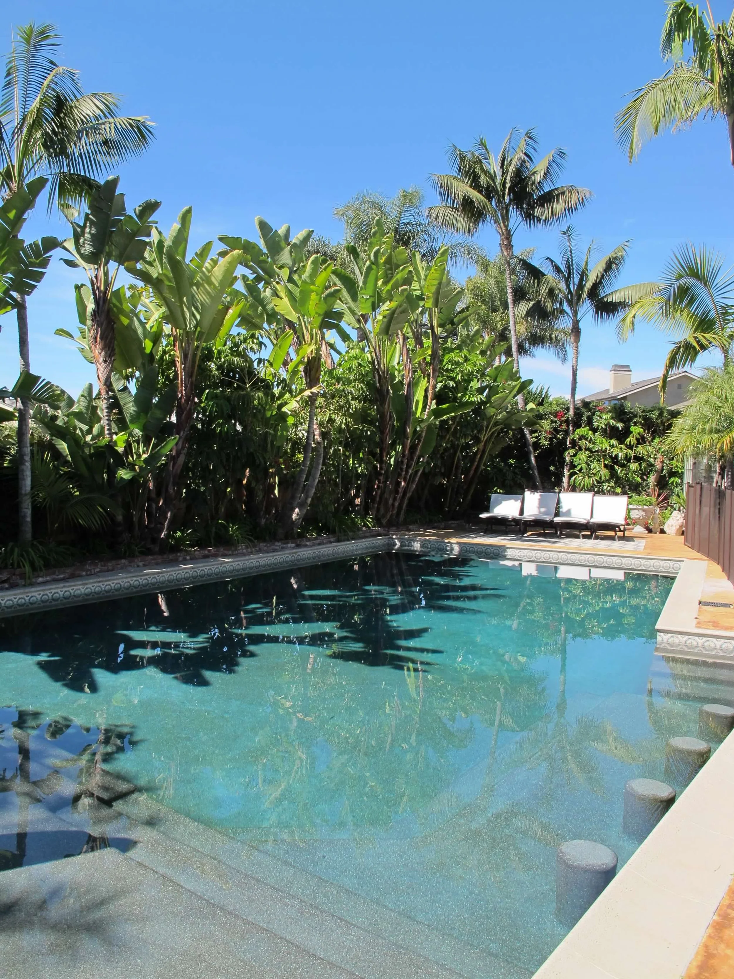 After: refinished pool with pebbleTec and created seating area with barstools and tanning deck.